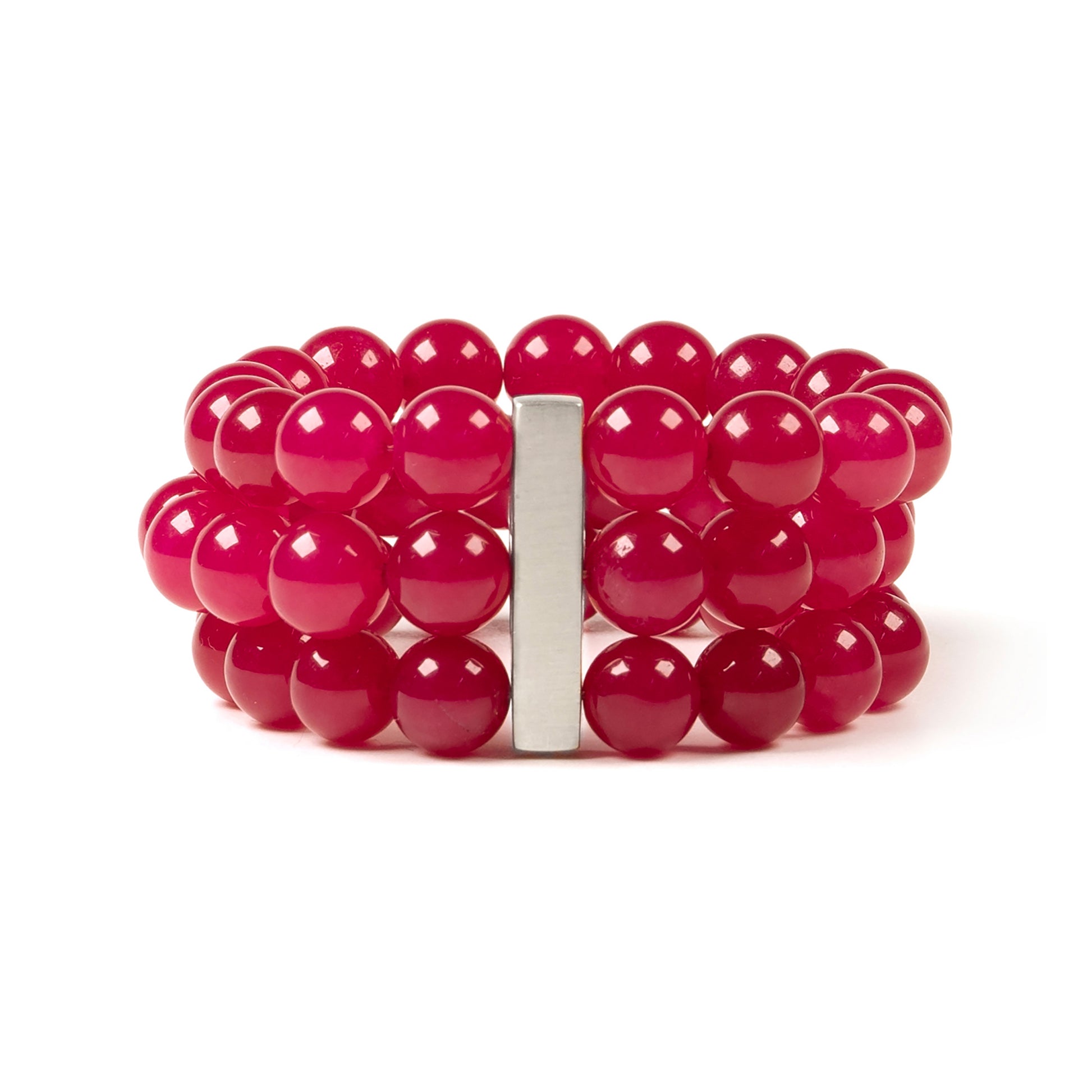 Das 3-reihige Armband "Luster" besticht durch sein exquisites Design aus dunkel-pink gefärbter Jade und einem puristischen 925er Sterling Silber Verbinder. Jade ist bekannt dafür, Glanz und Freude in das Leben des Trägers zu bringen, was sich auch im Namen des Armbands widerspiegelt. Dieses handgefertigte Armband ist ein einzigartiges Schmuckstück, das Freude und Glanz in dein Leben bringt.