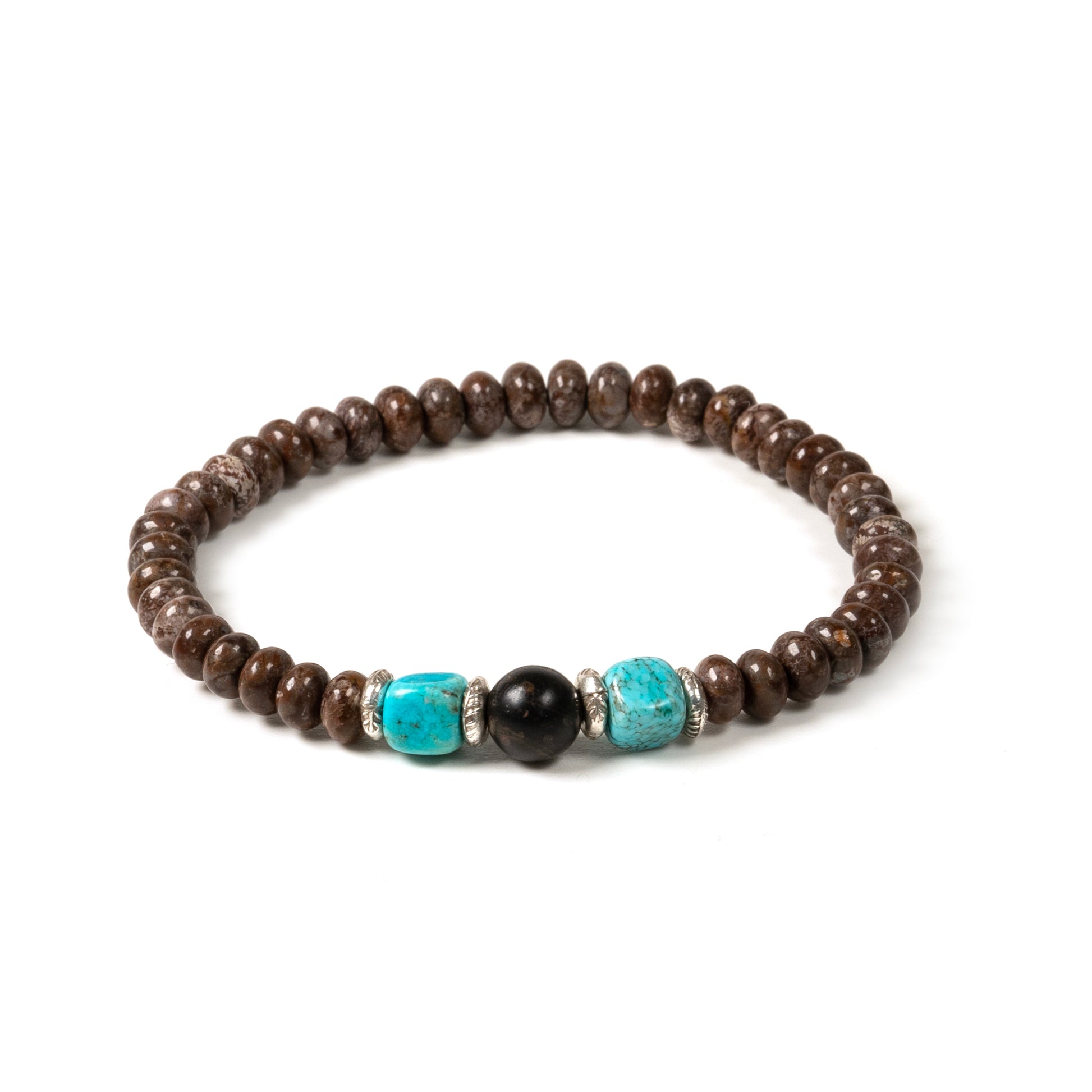 Dieses handgefertigte Armband aus glänzenden Obsidianrondellen und kräftigen Türkiswürfeln ist eine einzigartige Kombination von Heilsteinen. Obsidian unterstützt deine geistige Entwicklung während der Türkis als einer der wichtigsten Heilsteine überhaupt deine Lebenskraft stärkt. Traditionelle Karen Hill Tribal Silber Spacer und eine große Obsidian Perle runden das Design ab.