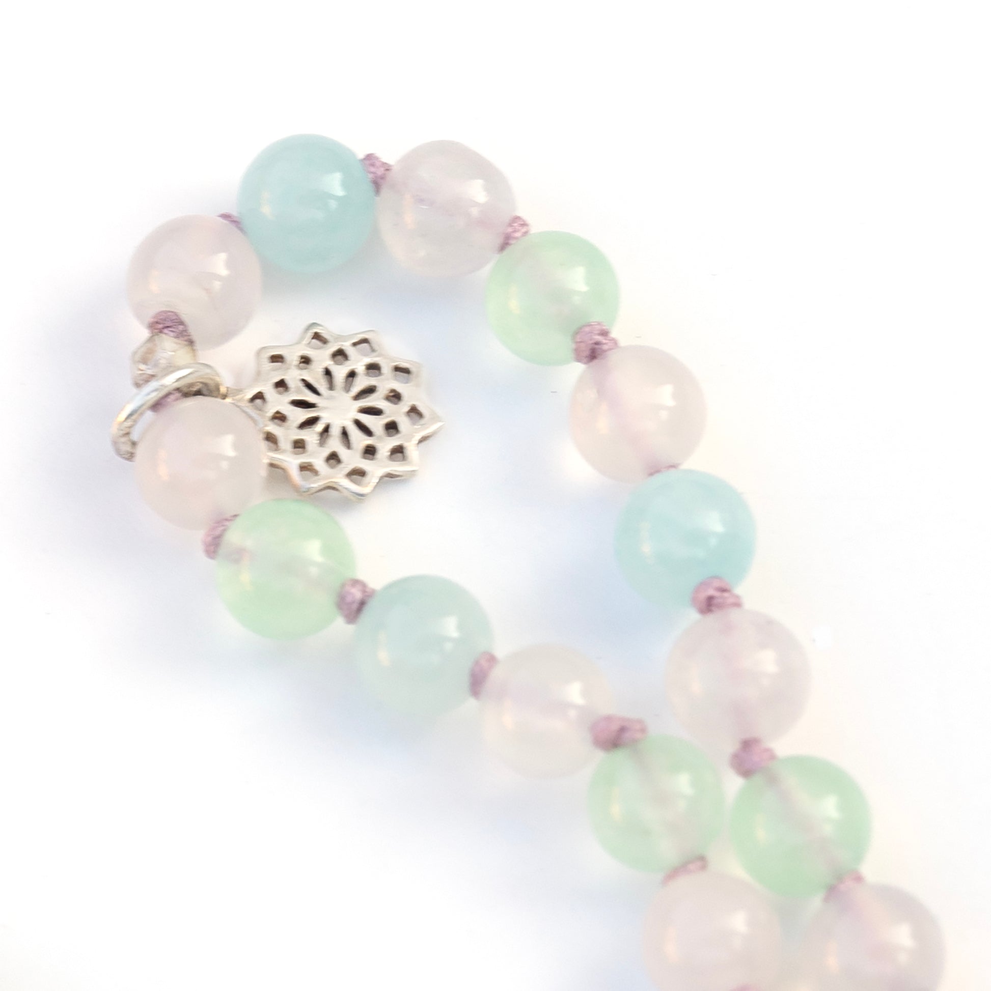 Die bezaubernde Malakette "Serenity", wird aus wunderschönen, pastellfarbenen Morganitsteinen und hochwertigen 925 Sterling Silberteilen handgeknüpft.