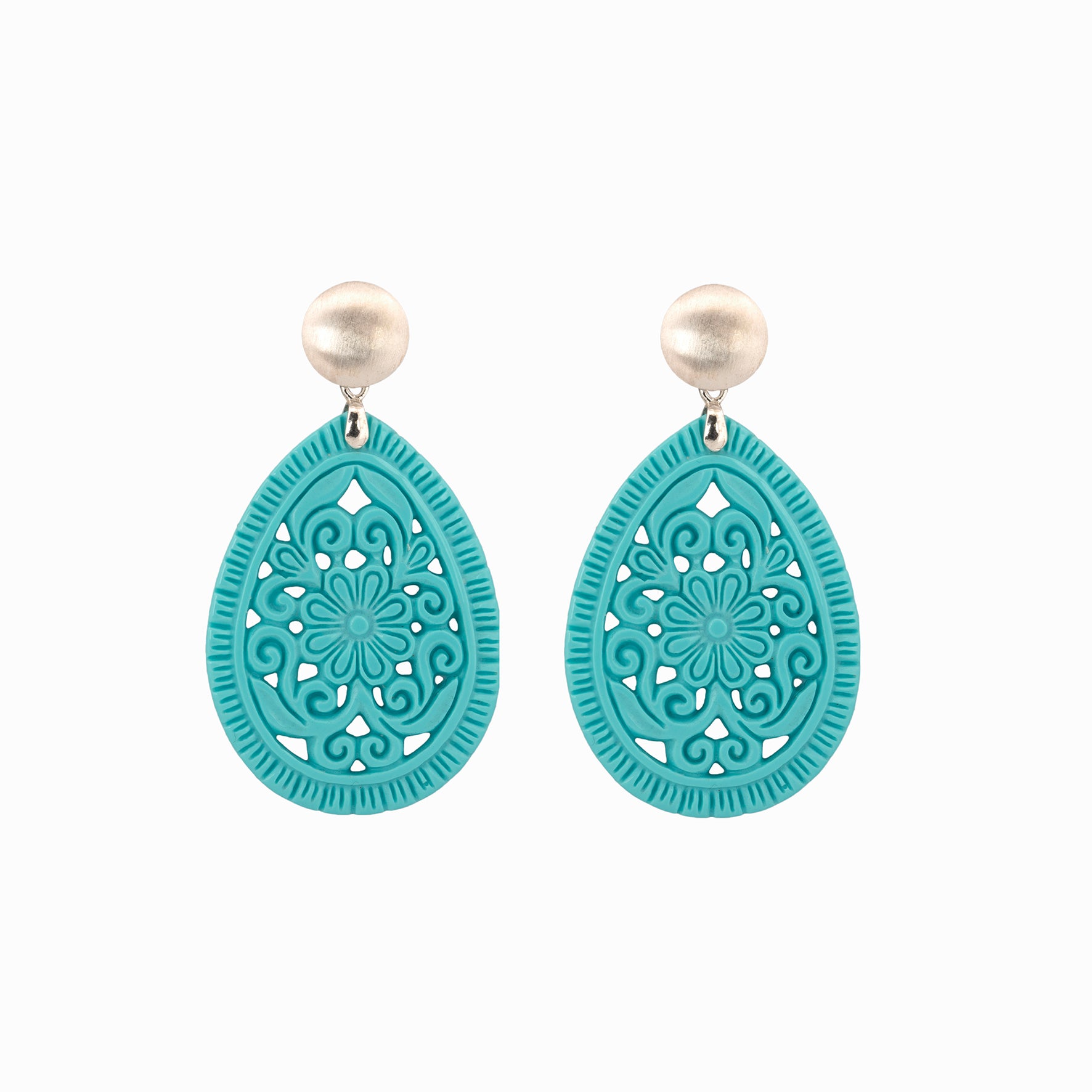 Unsere handgefertigten Ohrpendler aus 925 Sterling Silber und handgeschnitztem Türkis-Ornament mit floralem Muster sind ein wahrer Blickfang. Die silbernen Ohrstecker verleihen ihnen eine elegante und stilvolle Optik. Jedes Stück ist ein Unikat und vereint moderne Schönheit mit traditioneller Handwerkskunst. Die Ohrpendler sind ein auffälliges Accessoire, das jedem Outfit eine besondere Note verleiht. Trage sie und lasse dich von ihrer zeitlosen Eleganz begeistern. Ein Must-Have für alle, die nach einem modernen und stilvollen Schmuckstück suchen.